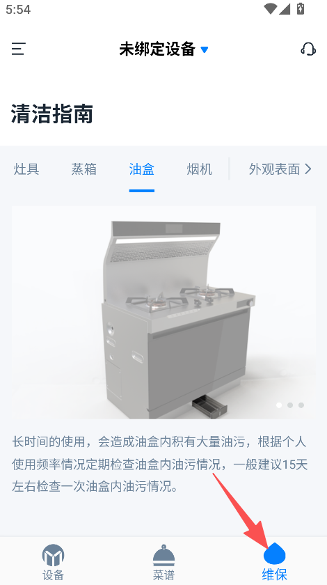 1、提供厨房设备清洁指导功能,涵盖灶具、蒸箱等设备,指导用户定期清洁,保持设备良好运行状态。