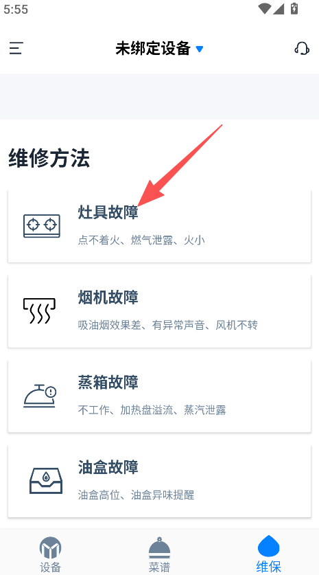 2、若选择维修方法,点击灶具故障等具体故障类型。