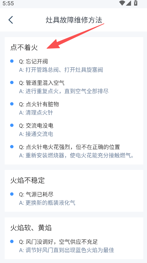2、维修方法细致入微,如灶具点不着火问题,罗列忘记开阀、点火针脏污等多种原因及对应解决措施,故障解决精准。