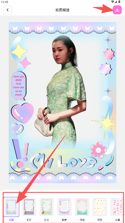 3、照片自动套用模板效果,可预览成品并点击右上角下载图标保存。