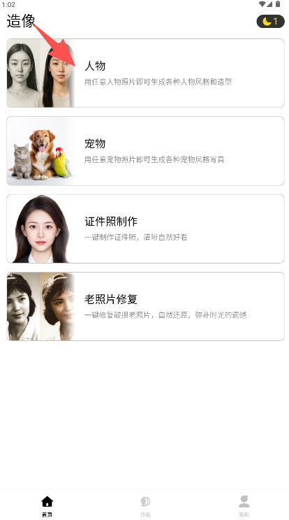 1、首页采用四宫格功能布局,清晰展示人物、宠物、证件照、老照片修复四大核心模块入口。
