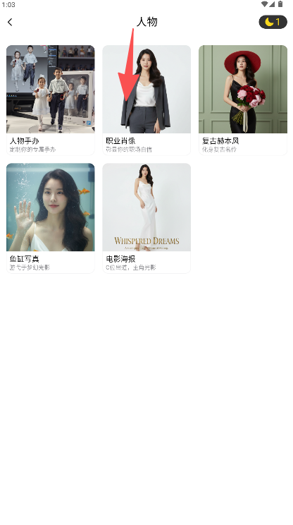 2、在人物风格模板页浏览并选择具体风格如“职业肖像”上传页面。