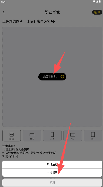3、在图片上传页点击“添加图片”按钮,从底部弹窗中选择“本地相册”以导入照片。