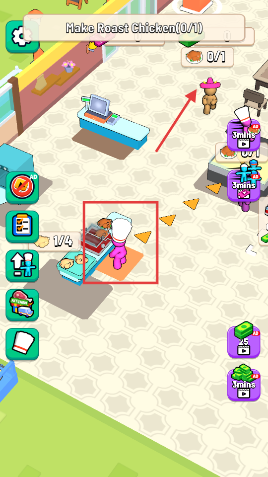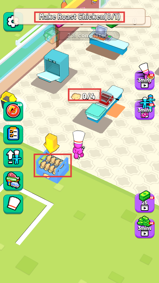 2、从鸡肉箱中获取鸡肉食材,满足【Make-Roast-Chicken(0/1)】的原料需求,推进菜品制作。