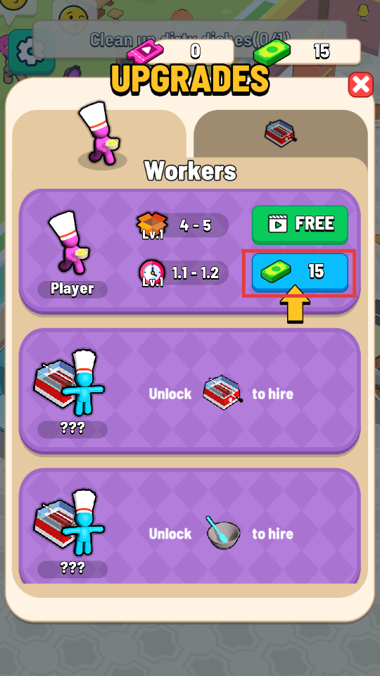 4、积累【15】元资金后,升级员工等级,提升工作效率,加快菜品制作与服务速度。