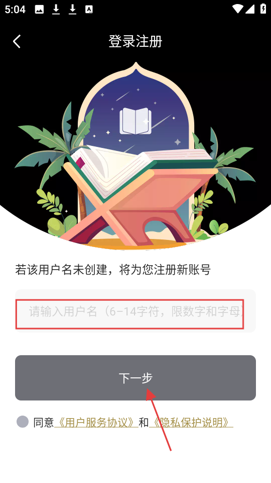 4、在登录注册页,输入用户名,勾选同意协议,点击【下一步】完成注册或登录。