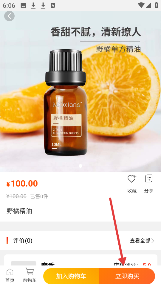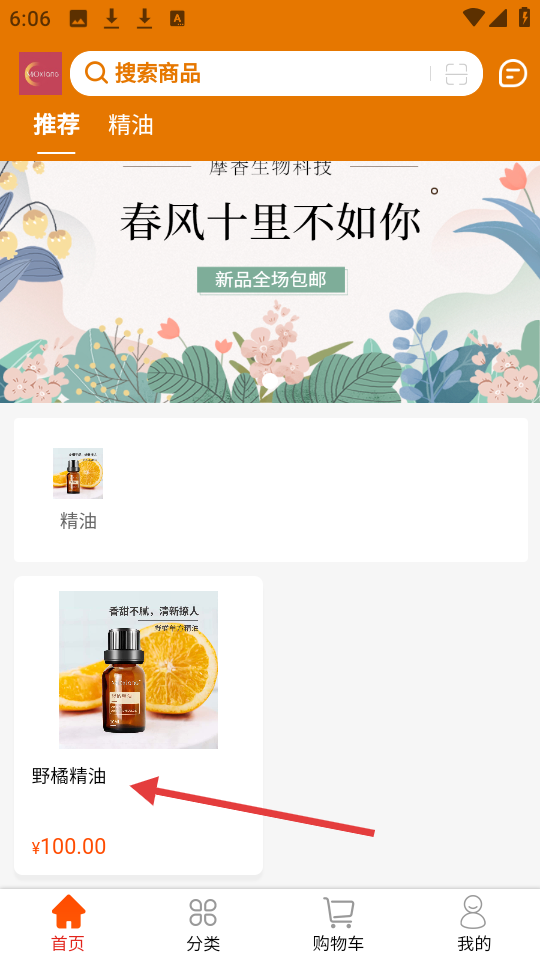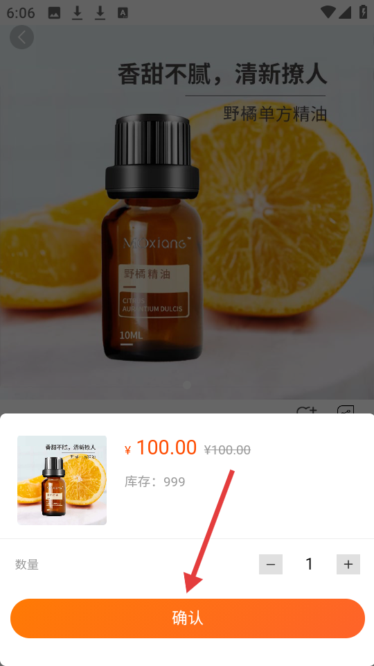 1、在商城首页点击【野橘精油】商品卡片,进入其详情页。