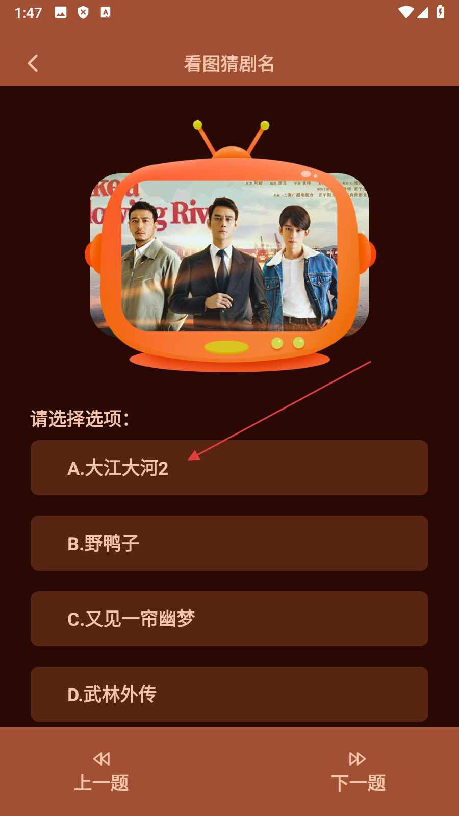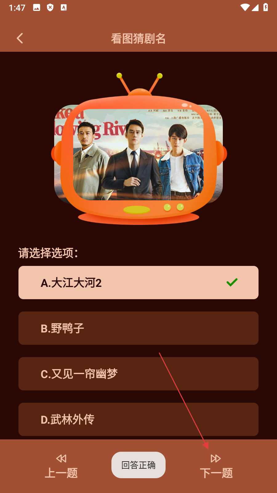 4、完成剧名猜测后,点击【下一题】,即可进入下一个猜剧名关卡。