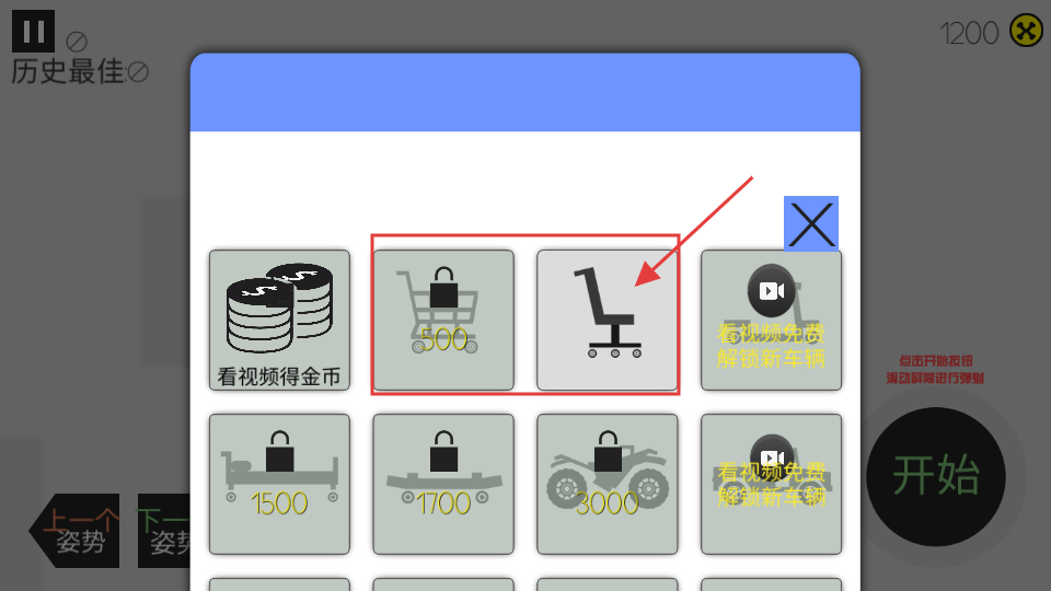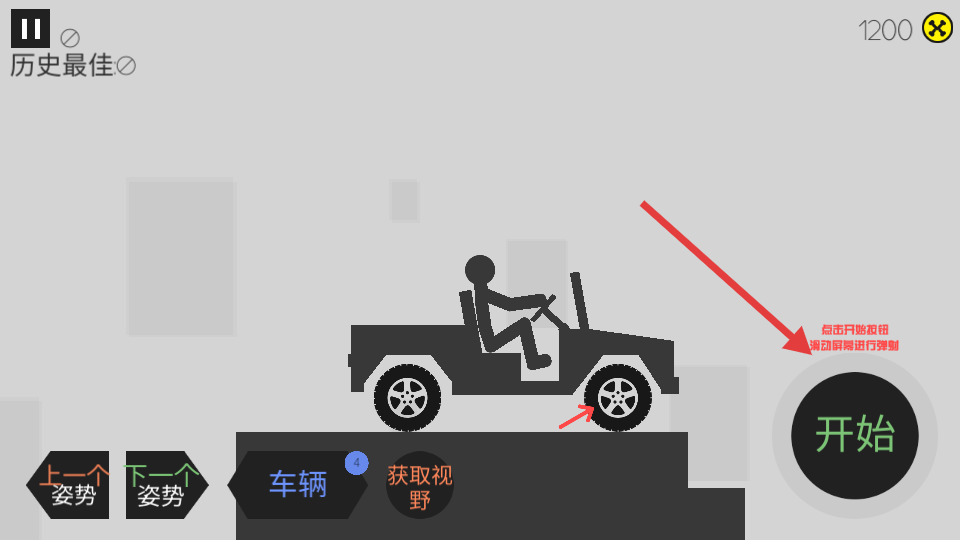 3、选择车辆后点击“开始”按钮进入游戏,通过滑动屏幕控制车辆行驶和动作,在不同地形中合理操作,提升飞行距离和得分。