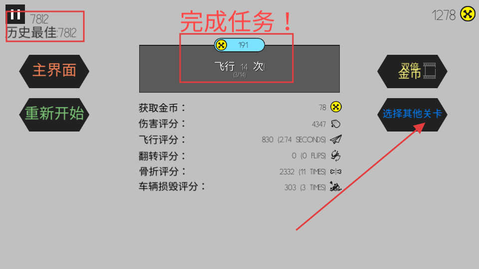 4、完成任务后可查看飞行次数,和历史最佳的飞行记录,若想挑战其他关卡可点击“选择其他关卡”。