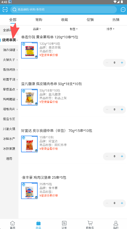 2、在左侧菜单栏选择“烧烤串类”找到目标商品点击进入详情页查看规格参数。