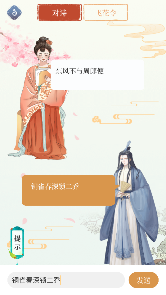 2、在对诗界面,由系统先出第一句,再在下方输入对应诗句,点击发送。