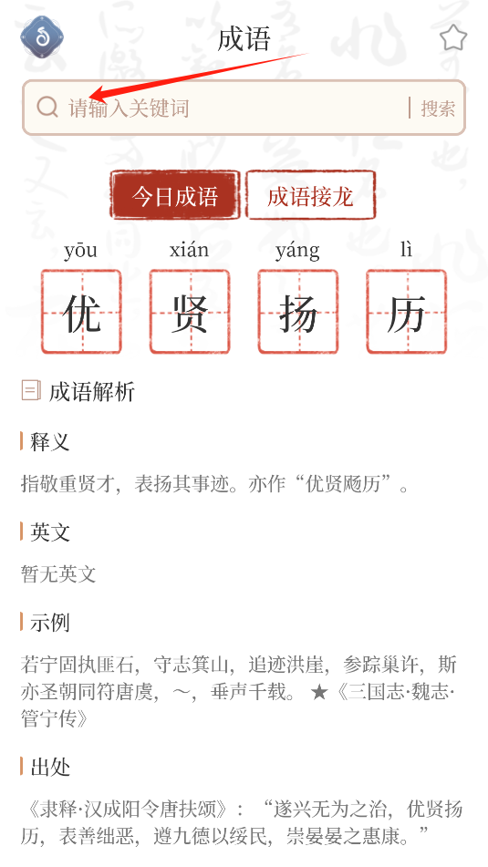 3、成语界面,可在最上方输入成语的关键词,寻找想要的成语,下方即会呈现释义、示例、出处等相关信息。