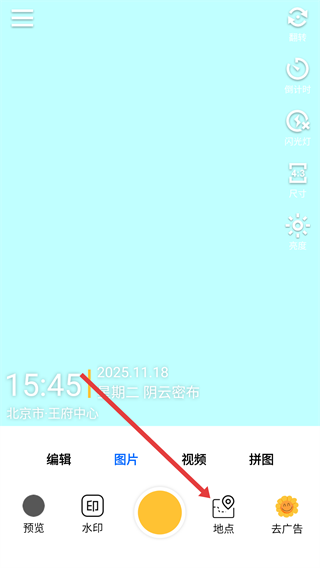 1、打开【云联水印相机】App,点击界面下方【地点】按钮,即可进入地址设置环节。