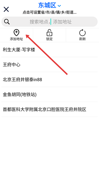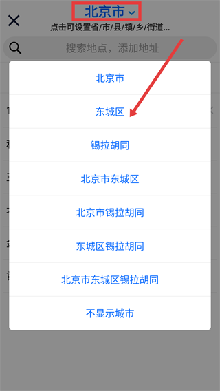 2、进入地点设置后,选择所在城市区域,如【东城区】,为后续精准定位打好基础哦。
