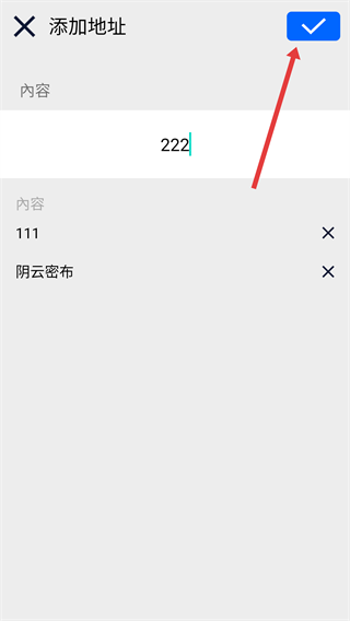 4、在添加地址界面输入内容后,点击右上角确认按钮,就能完成地址设置,水印地址就准确啦。