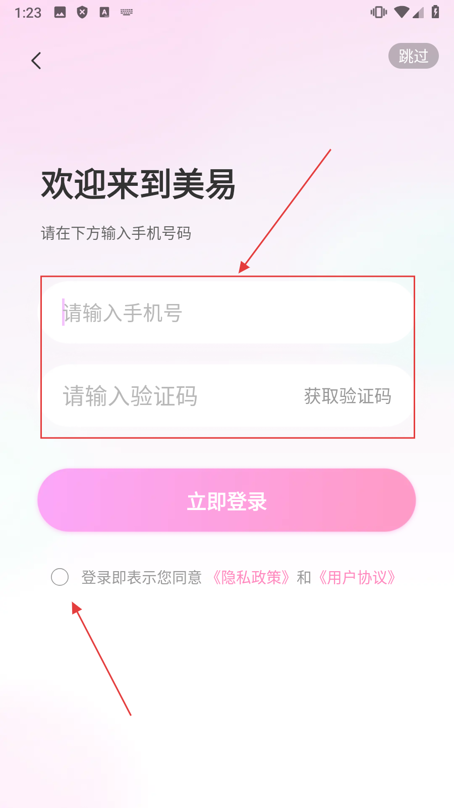 3、在信息填写页面,输入【手机号码、验证码并同意协议】,准备登录。