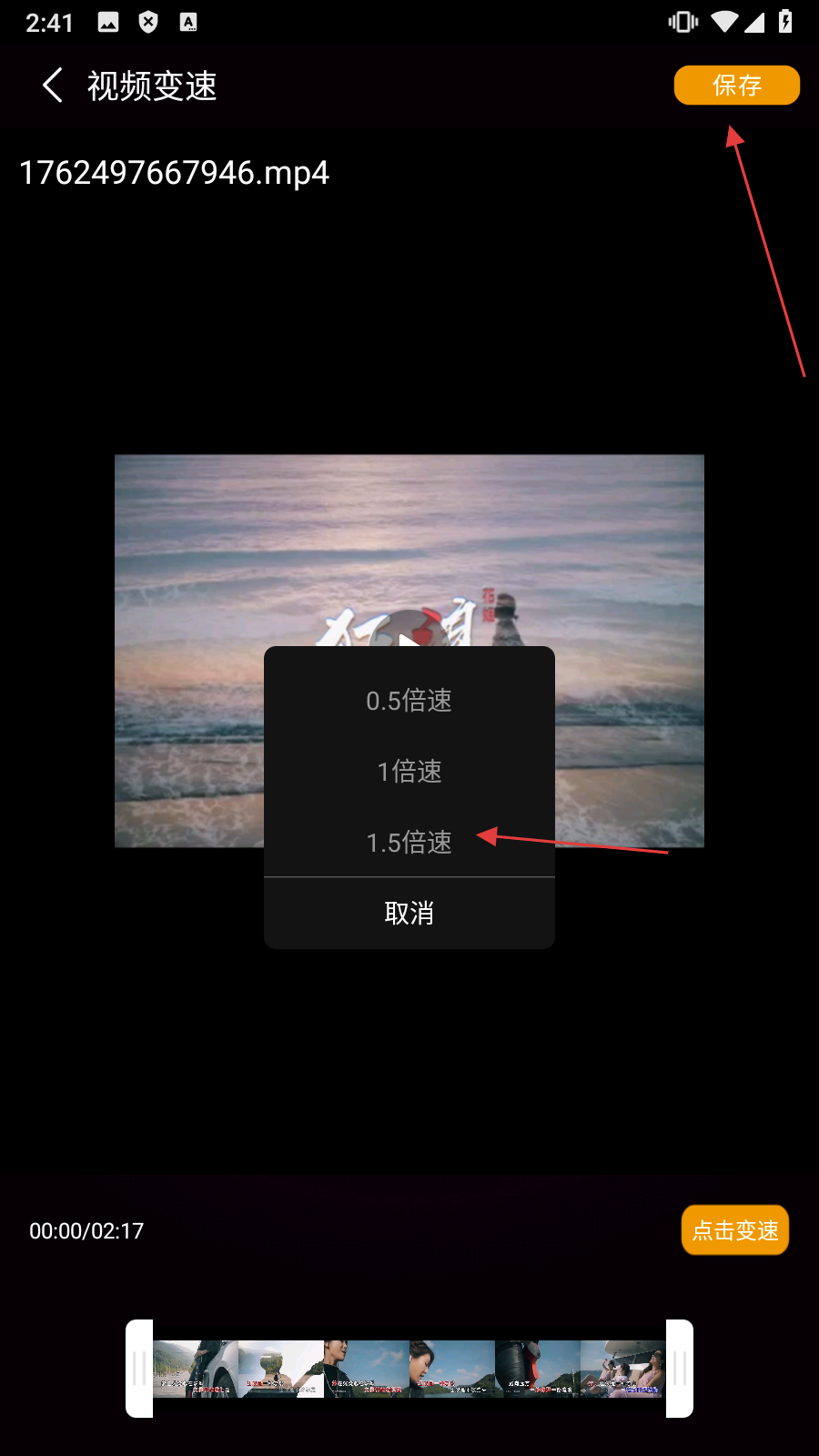 4、【选择倍数】后,点击【保存】,即可完成视频变速操作。