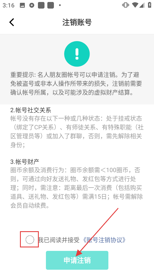 4、在注销账号页面,勾选我已阅读并接受《账号注销协议》,然后点击【申请注销】按钮,即可申请注销账号。