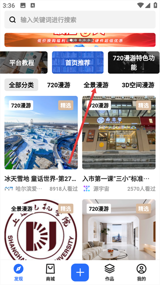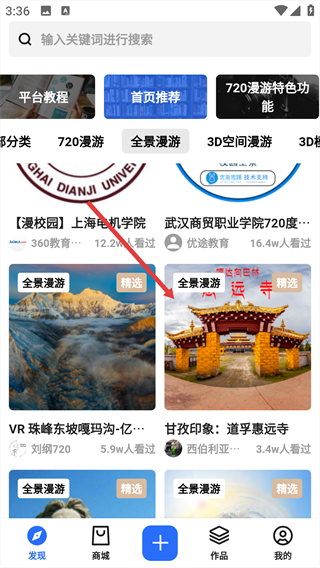 1、在发现页面,点击【全景漫游】标签,切换到该分类对应的内容展示列表。