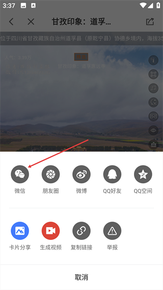4、在弹出的分享选项菜单中,选择【微信】这一分享渠道,完成微信平台的分享操作。