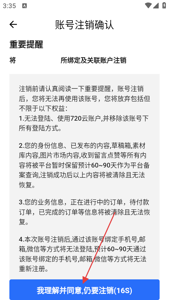 4、在账号注销确认页面,阅读重要提醒后,点击【我理解并同意,仍要注销(16S)】按钮,完成账号注销操作。