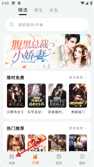 1、在书城页面点击【搜索图书/作者】栏可进入搜索页面。