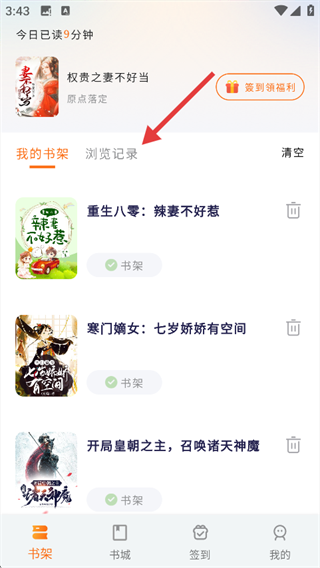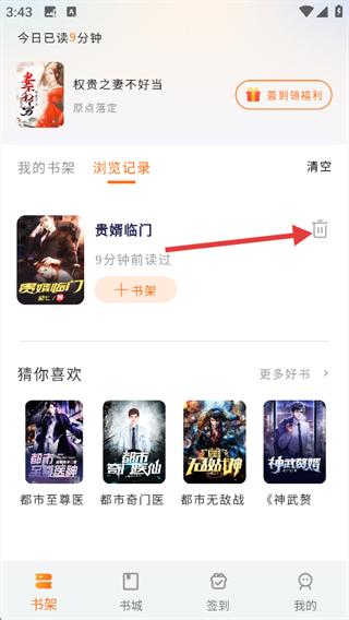 3、在【浏览记录】中,找到对应书籍,点击右侧删除按钮。