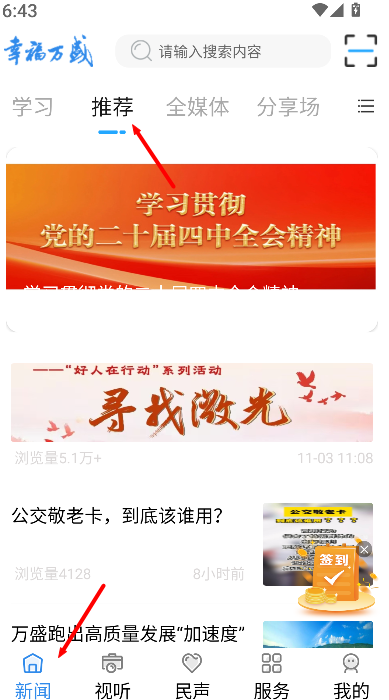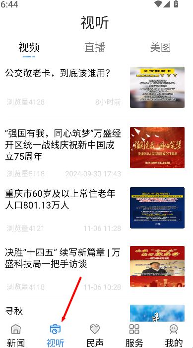 2、在页面上方找到“视听”入口,可进入直播、视频等板块,观看本地节目和相关主题影像内容。