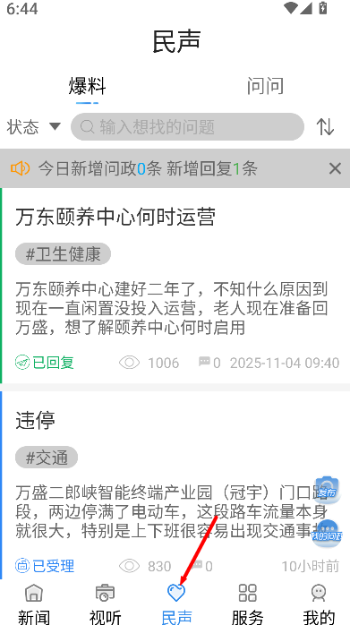 3、在首页栏目中找到“民声”区域,可选择爆料或问问入口,提交问题、反馈情况或查看公共话题讨论。