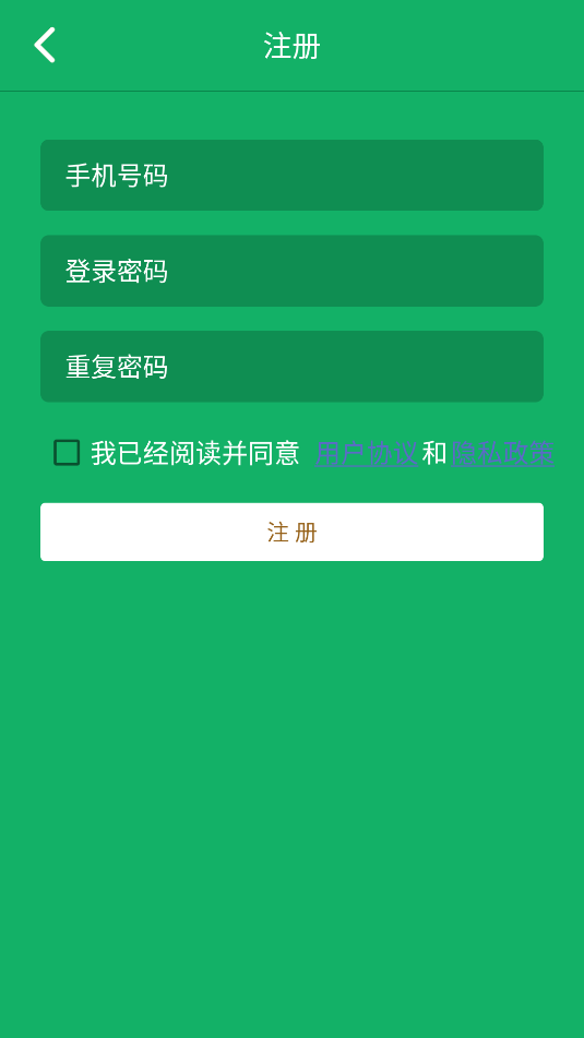 3、输入手机号码,设置登录密码,重复输入一次密码,点击注册即可。