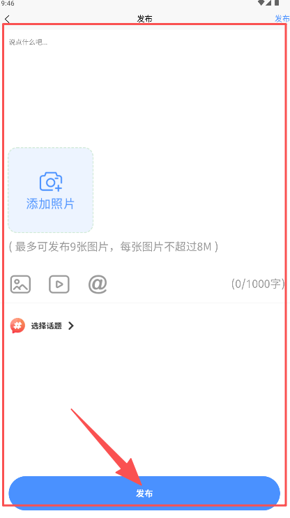3、在发布页面输入文字内容、添加照片后,点击底部“发布”即可完成内容发布。