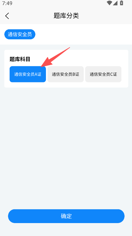 1、进入题库分类,选择通信安全员A证、B证或C证科目,点击确定。