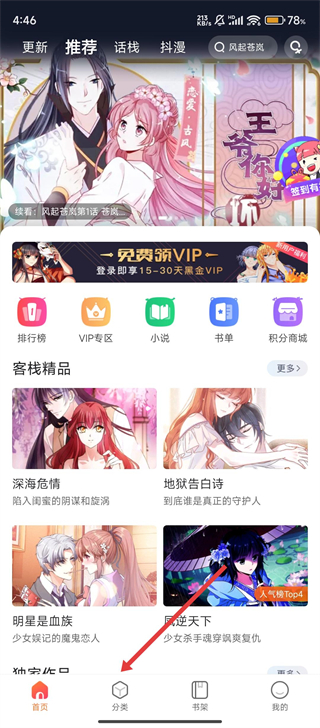 1、进入漫客栈App,在首页点击底部的【分类】选项呢。