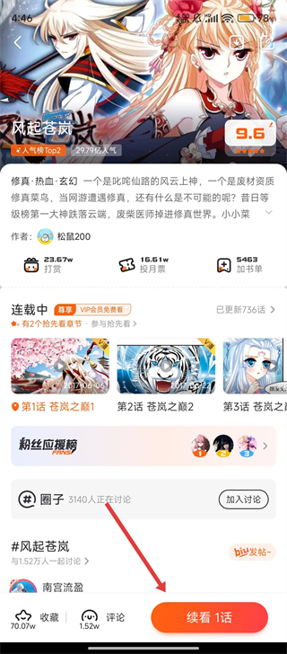 3、进入作品详情页,点击【续看1话】按钮进入观看啦。