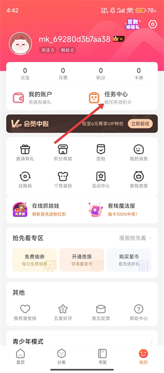 1、打开漫客栈,在我的页面点击【任务中心】进入任务页面哦。