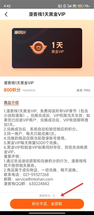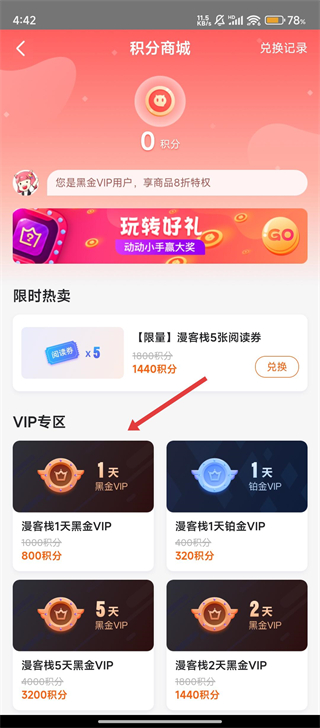 3、在积分商城的VIP专区,选择【漫客栈1天黑金VIP】进入详情页啦。
