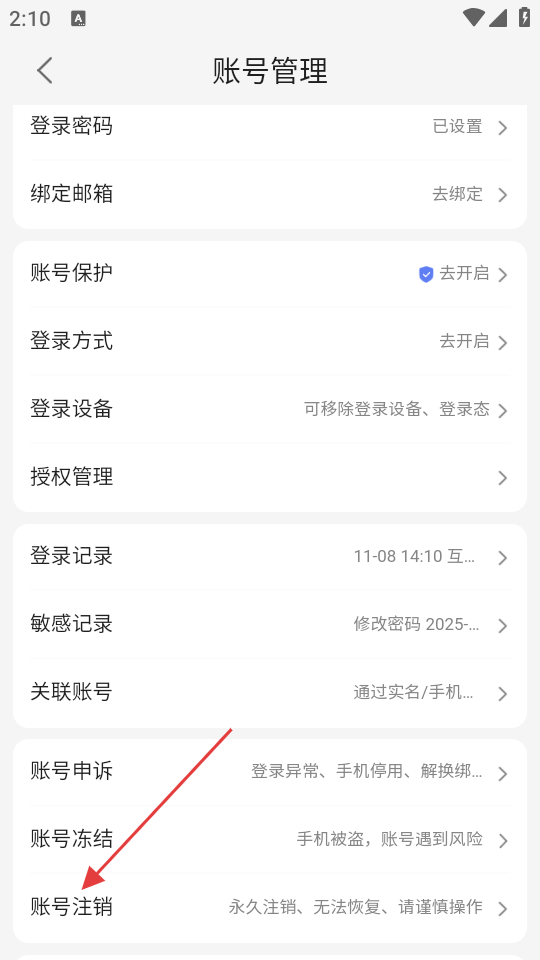 3、在账号管理界面中,点击【账号注销】选项,可进入账号注销说明页面。