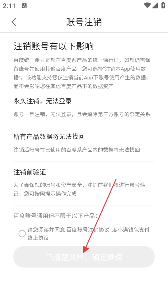 4、在账号注销说明页面中,阅读相关风险提示后,点击【已清楚风险,确定继续】按钮,可继续账号注销流程。