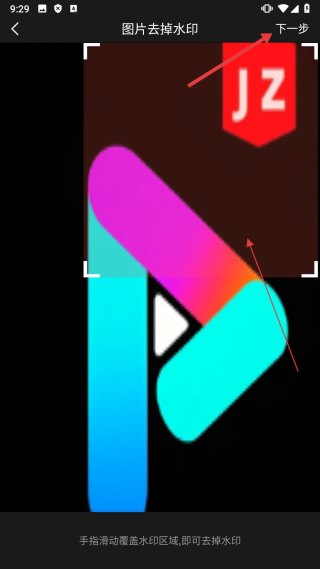 3、在图片去水印编辑界面,滑动【覆盖水印区域】后点击【下一步】,进入预览图片界面。