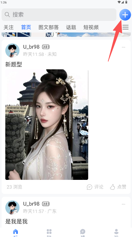 2、导航结构清晰地将首页、图文部落、话题、短视频等不同内容形态分区呈现。