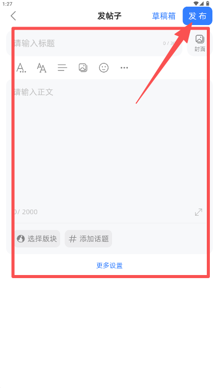 2、内容发布功能支持用户编辑标题和正文,并选择相应版块进行图文帖子的创建与发布操作。
