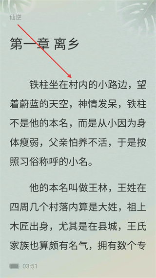 4、进入《仙逆》阅读页面后,即可开始阅读【第一章离乡】。