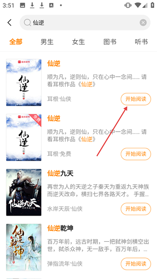 3、在搜索结果中找到《仙逆》,点击其右侧的【开始阅读】按钮。