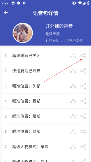 3、在语音包详情界面点击【分享图标】,展开分享方式选择界面。