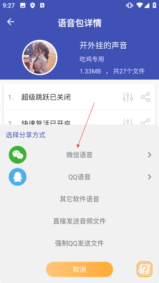 4、在分享方式选择界面,点击【微信语音】,即可通过微信分享该语音包。