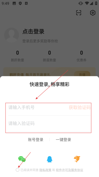 3、在登录信息填写界面,输入【手机号、验证码并勾选协议】,准备进行账号登录。
