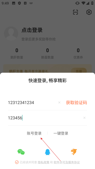 4、在登录信息填写界面,点击【账号登录】,即可完成账号登录操作。