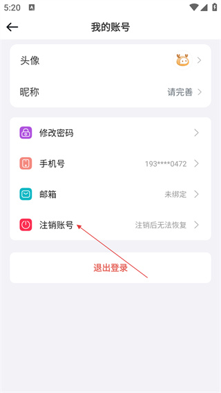 4、在我的账号页面,点击【注销账号】选项,可进行账号注销操作(注销后无法恢复)。