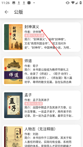 3、在公版书籍列表中,选择如【封神演义】之类的书籍。